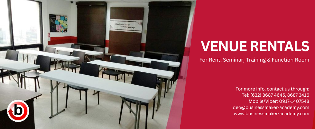 Located at the Philippine Stock Exchange Building in Ortigas Center, the Businessmaker Training Center & Lounge offers you the perfect venue for:
